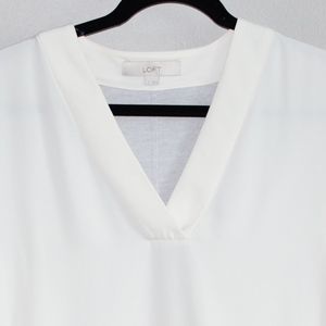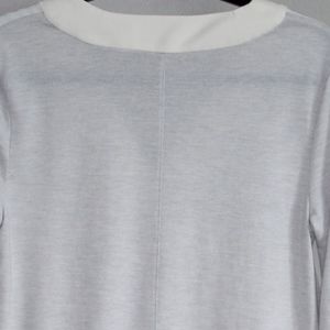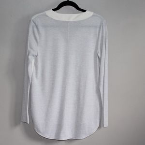 Classy AnnTaylor Loft two toned tunic blouse for work or play. Materials include front body 100% polyester, back and sleeves 80% polyester and 20% rayon. In Excellent pre-owned condition. The front and neck color is comprised of a cream/ivory and back and sleeves are a light grey. Size Small