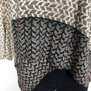 DETAILS: This is a fun draped tiered sweater top from Anthropologie brand MOTH. Ivory cream color with black print. Orange beaded embellishments. 3/4 sleeves. High-low styling; shorter in the front.