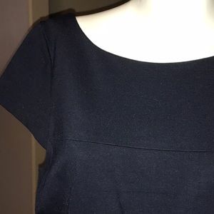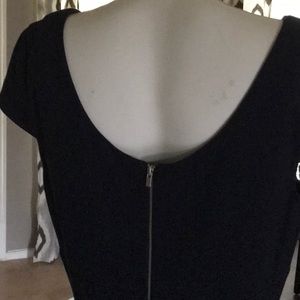 Dark navy, cap sleeves, exterior back zipper, rounded neckline, lower rounded backline, average height would hit knee length. This dress could easily be dressed up for a formal occasion or a cocktail dress. Pictures honestly don’t do it justice.