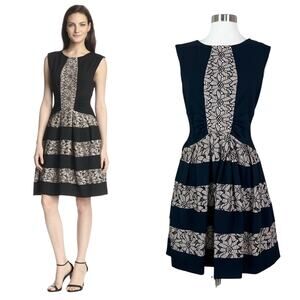 •Features: Gorgeous silk dress by DVF, Navy Blue and Creamy White Chevron Print, Squared Neckline, Flowy Elbow Length Sleeves with Sheer Panels, Lined, Shift Silhouette