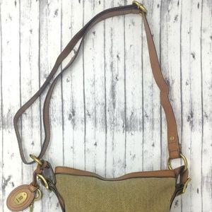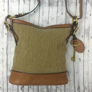 FOSSIL-Vintage Leather Crossbody Handbag; Exterior features heavy canvas fabric with leather trim, antique brass hardware, adjustable shoulder strap, and FOSSIL large key hangtag. Interior features zipper closure, cinnamon color signature fabric lining, zipper pocket, credit card slots, and pocket slots. L: 10" W: 3.5" 10" Shoulder strap drop: 23.5" ***No signs of handling or wear***