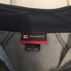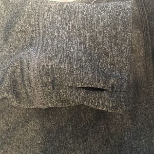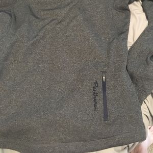 A charcoal gray Pitt quarter-zip sweatshirt with a fuzzy interior. There are thumbholes on both sleeve and a pocket on the back next to an embroidered "Panthers". It's super nice and casual to wear around.
