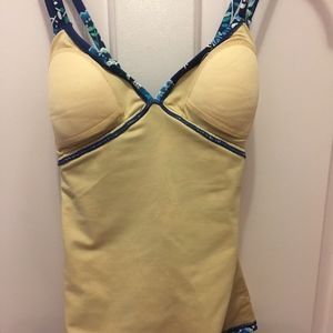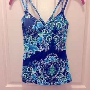 BRAND NEW WITH TAGS! OVER 65% OFF!! (In pkg-only taken out for photos). Gorgeous tankini top in beautiful shades of vibrant blue w/ adjustable straps, fully lined with lightly padded bra. The colors are so pretty! Shell is 75% nylon, 25% spandex and lining is 92% polyester, 8% spandex. This top will go w/ any swimsuit bottom and with skirts, shorts, etc. Perfect for the beach, pool, etc. or just lounging on your deck. Machine wash, tumble dry. I recommend line drying.