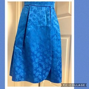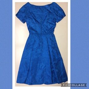 BOMBSHELL blue vintage dress in a pretty FLORAL brocade! Likely handmade (NO tags/labels). Beautiful quality fabric & nice workmanship. VERY form-fitting through bodice (partial zippered back closure). A bit of flair in the skirt (fold-over front on skirt). NO stretch to fabric. Please check your measurements before purchasing. BUST 32, Waist 22, Hip 36/38 & total length 39 IN. Measurements are my best approximate. 💙