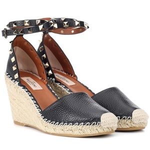 VALENTINO Rockstud Espadrille Wedges in Black Leather, size IT 37/US 7