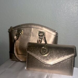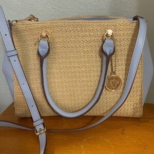 Large coach tote in cream and brown has one inside Ziploc pocket has some stains on the inside dimensions are19” across center 11 1/2” deep 6 1/2” wide 8” handle drop Will carry almost as much as an overnight bag
