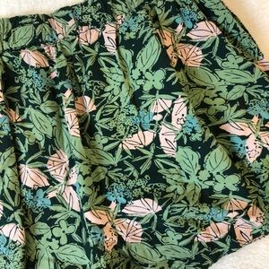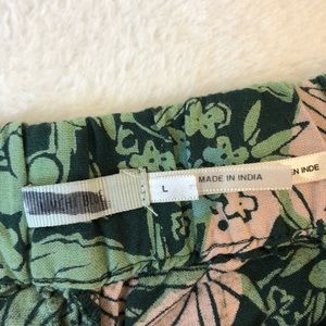 Kimchi Blue, Green Tropical Print, Chrissy Shorts In a size Large. Gently pre-owned with no visible flaws. These cute & comfortable shorts feature ties at the legs, pull on with elastic waist band, Front pleating, Pockets In a fun Green and pink leaf and flower print. Approximate measurements taken laying flat include 15.5 inches across at the waist, 12 inch rise and 2.5 inch inseam.