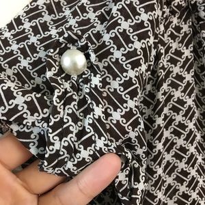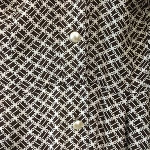 Brown & Ivory Dress. Commercially made, tag has since frayed away. Iridescent Off white buttons, all are intact. Cuffed sleeves w/ button detail. Belt loopholes although no belt. Two breast pockets. True to 40s/50s edges are unfinished resulting in some fraying. Not visible while wearing & doesn’t affect structure. This is a vintage piece. Please ask any question prior to purchasing.