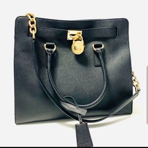 Gorgeous authentic Michael Kors large Hamilton saffiano leather satchel. Rolled top handles and shoulder straps. Goldtone accents with logo accented lock. 11" width 9.25" width. This is a large beautiful bag! Does not have tags but comes with card. Make an offer or a bundle thanks for shopping
