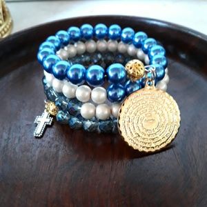 3 Tier, of Glass Pearls & Crystals with goldtone metal round prayer's pendant & silvertone metal cross