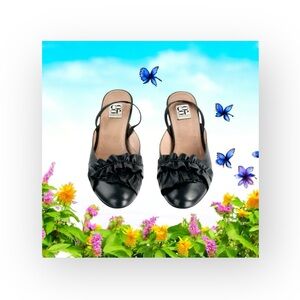 Understated elegance: an open back shoe features embellished pearlescent studs along the ankle for a standout take on a go to style. Pointed toe. Scalloped trim. Lightly padded footbed. Simply chic โจ