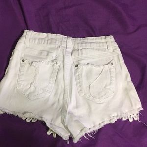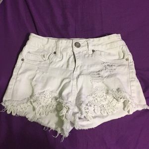 White jean shorts, high waisted with lots of fabric embroidery at the bottom the the legs and small worn rips (supposed to be there) on the front of them