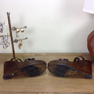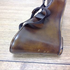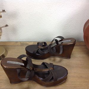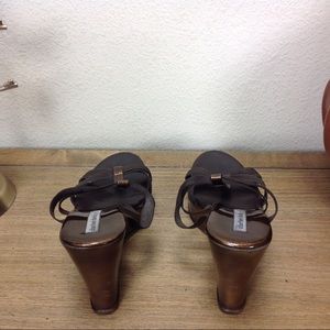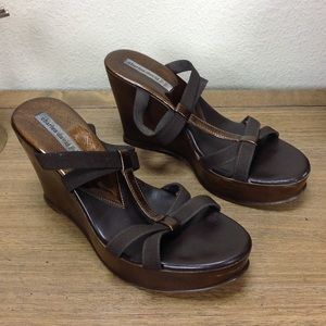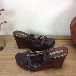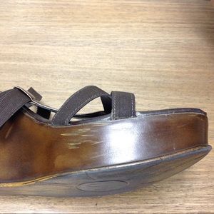Brown elastic straps anchored by bronze leather center strap with distressed brown wedge. Some scuffs on the wedge (see pics) but otherwise is good condition. Thanks for your interest! Please checkout the rest of my closet.