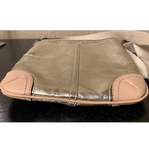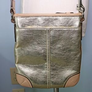 GUC metallic gold Coach crossbody swingpack purse. Has a long canvas adjustable strap. Very shiny gold metallic look with leather accents. Has a slot on the front of the purse as well as the back. The top opens with a zipper and the inside has one side slip style pocket. In great shape, strap a little dirty used at outdoor concert which I purchased for and I lost hangtag while there. The purse itself measures 7” across and 8.5” high. Ask questions. Ship same/next day Mon-Sat excluding holidays.