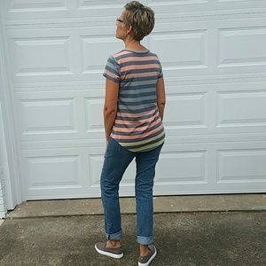 Beautiful horizontal striped t-shirt. 63% Polyester, 33% Rayon, 4% Spandex. Made in the USA. Model is wearing a small.