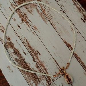 Seashell Treasure Necklace. Natural seashell with14 kt yellow gold accent painting. 16 inch rigid pearly cream beaded necklace has a large decorative clasp that hangs in front. Seashell is hooked in the clasp. Cute and always stays in the correct place on your neck.