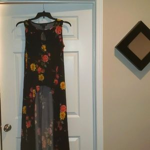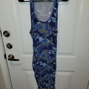 Short sleeved v neck tyed dyed mini dress with lots of stretch. It has a twisted design in the front. Fits really nice. Very nice material.