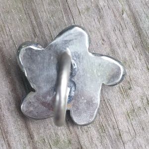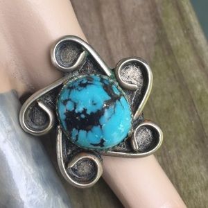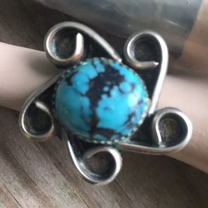 Turquoise pinky ring size 4. Silver tone. Vintage. Measures 1” in diameter. I cleaned this ring but it still has a little green in the cracks, so it would need to be taken to a jeweler for cleaning. Tags: Arizona, southwest, southwestern, Indian, native, crimson, sunset, collection.