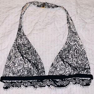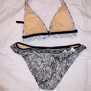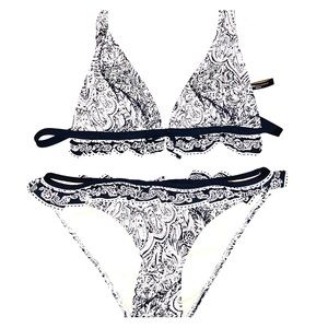 Super cute black and white paisley print bikini by BCBG!! Triangle top with gold hardware and ruffle trim on both pieces. Lined and lightly padded. The top is a small and the bottom is a medium (for full coverage) Very flattering and classy!! No visible signs of wear.