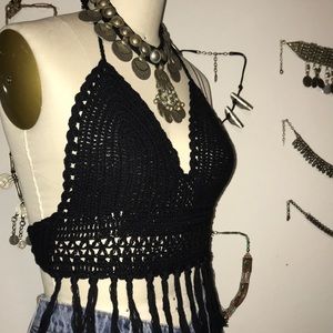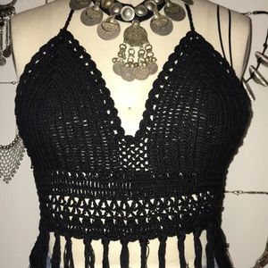 Black Crochet Festival Halter Fringe Crop Top