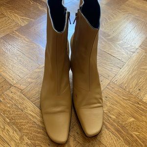 Lovely beige booties with metallic silver kitten heels. This is a cute and funky bootie looking for the next fashionista to give them continued life. Very good condition.