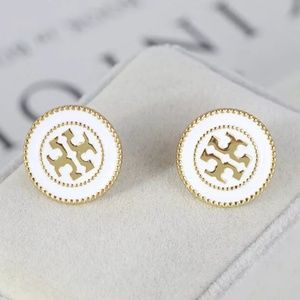 Authentic Tory Burch White Enamel Disc Button Stud Earrings in Raised Gold Tone with Detail Beading