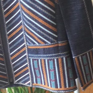 Exotic embroidery enhances the front and back of this denim cropped cape/jacket. Zip front closure, lined. Very stylish and unique jacket. Wear it with shorts for extra drama!! Cape style leaves your arm free for movement.