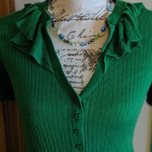 Bright and elegant shirt sleeve sweater with button and rifle detail at collar. Looks amazing with a skirt and dress sandals. Lightweight material that is great for warm weather! In great condition. Hardly used.