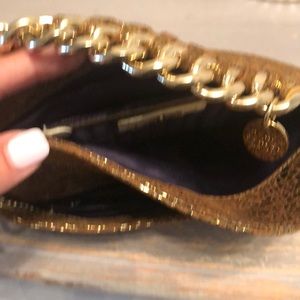 Beautiful Bronze/gold sealed with a kiss clutch. Has two separate compartments. Comes with a long chain for shoulder to give you options. Used twice! In pristine condition