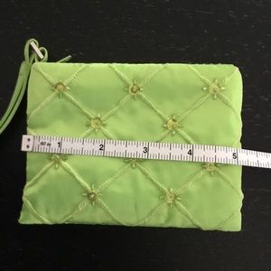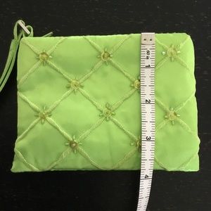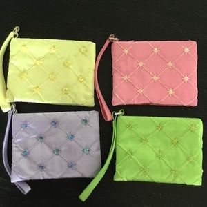 4 cute little satin bags. 1 each of yellow, pink, lavender, lime green. Braided nylon shoulder strap. Satin wrist strap. Zipper top. Embroidered lattice design with sequins on front. Slightly padded so great for packing jewelry when you travel.