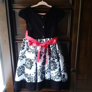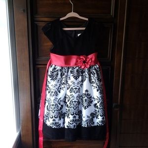 Size 5 holiday dress -black and white velvet like dress with deep red tie and flower detail. Only worn a few times for pictures.