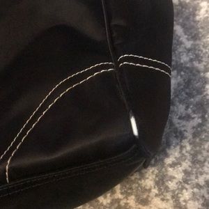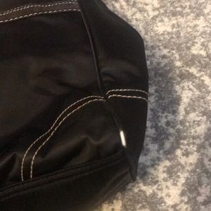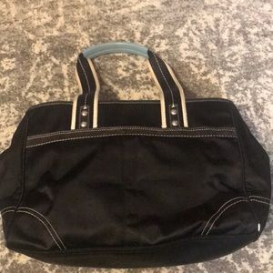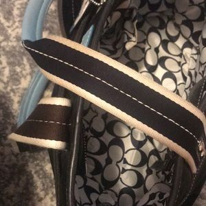 Cute black nylon coach bag with white and light blue trim. Bag is used. Bag is in great condition minus the wearing at the corners of the base (as pictured). Interior lining is white with the signature pattern. Only a few small stains. White trim on shoulder straps is a little discolored. Bag is 13x8x5.