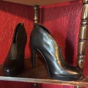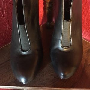 In gently worn condition. Color: Black. SZ:9. There's a very small nick on the bottom of one shoe(shown in last photo) but I always just used shoe polish & it isn't noticeable. 100% leather upper. These booties look great paired with midi dresses & skinny jeans. 5" heel with a 3/4" platform