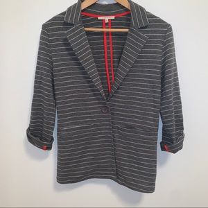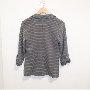 Soft and comfortable. Grey striped blazer. Stretchy fabric-95% cotton. 5% spandex. One button on front. Sleeves can be worn down or bottom up!