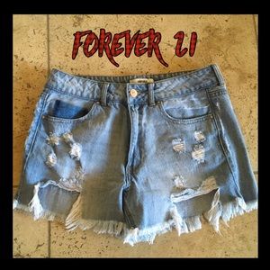 Forever 21 distressed denim shorts. Frayed edges, one rear pocket, zip fly.