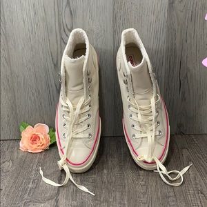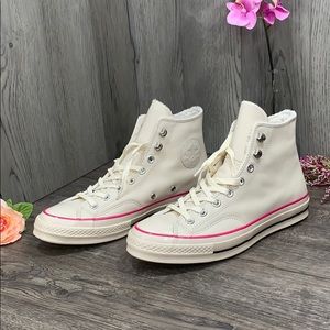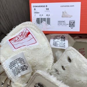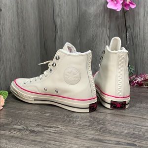 NWT authentic new in a box (no lid) Converse shoes MPN: 162434CModel: Chuck Taylor All Star Hi - Materials: Leather/Faux Fur/Rubber - Color: Natural Ivory/Pink/Black - Gender: Unisex - Size: Women's 10 Men's 8