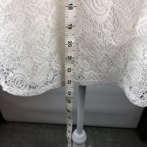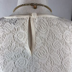 Lace overlay with satin trim. Bust darts for better fit. Keyhole closure with button. Lenghth: 23"