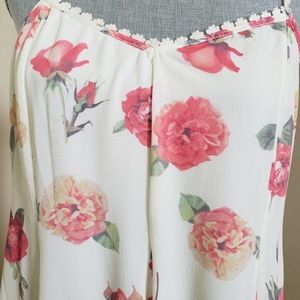 White & rose floral dress. New with tags. Has white lace around neckline. Adjustable straps. Has a white lining sewn in (attached) . Fabric flows nicely. Size Large but fits more like a medium. This would be beautiful for a spring wedding or Sunday brunch