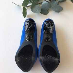 Blue Suede peep toe platform pumps. Black geometric heel.