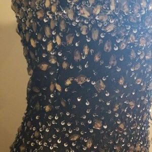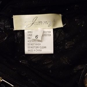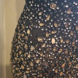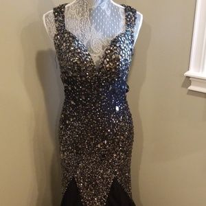 Jasz Couture black beaded prom or homecoming dress. Open back detail. Small zipper right ar buttox area. Shoulder blade area has clasps to help get dress on. There are several beads missing as shown in the pictures (not all bare spots pictured). Priced to sell given there are beads missing. I would say the beads are a light yellow color and there are small grey beads with silver sequins. Bottom hem of dress is lined with small silver sequins