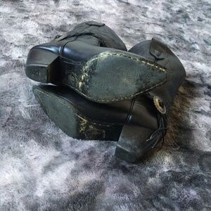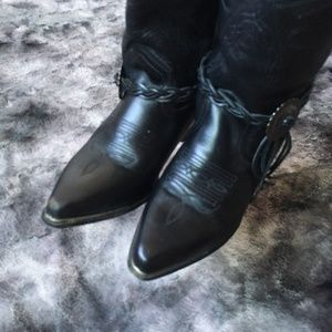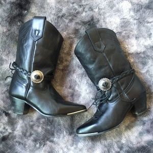 The perfect staple cowboy boots with details to add flare. All black leather construction with black patterned stitching detail and pull tab top. Removable braided leather detail with fringed ends and silver at sides. Silver toed bottom. Lightly padded insoles.