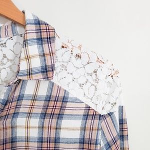 Melrose & Market Plaid Flannel Lace Shoulder Top