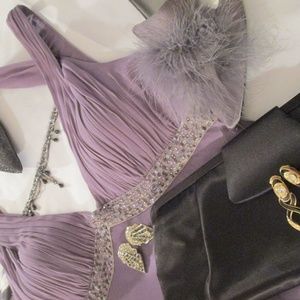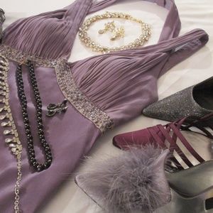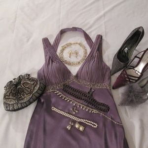 ANDRIANNA PAPELL 100% lined silk dress embellished with netted beading and sequin (mid purple - amethyst). GORGEOUS, CLASSY, and FABULOUS! Halter back out, straps over neck and shoulders, pleated chiffon layered bust, flowy and drapes nicely. Hook/snap closure around neck, and side zipper closure. Accessories not listed at this time. Approx. measurements are: Length 44”, Armpit to Armpit 18” flat, Hip 18 ½” flat. Size 4 – NWT