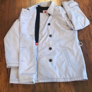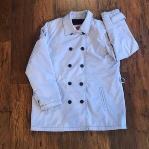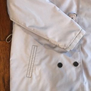 In great condition! A pale Lavender in color, functional double breasted buttons. Fleece and Padding on inside for extra warmth, and 2 pockets. Black threaded detail, button detail in sleeves. size L is true to size. Has belt loops. BELT IS INCLUDED! Coat is 30 inches long from shoulder. No tears, rips or stains!