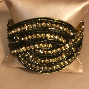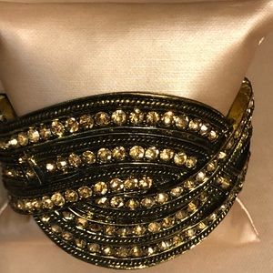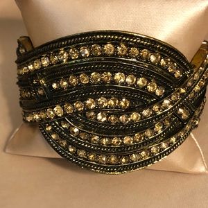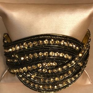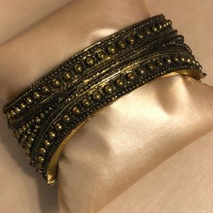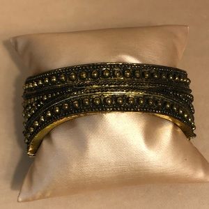 Bangle fits 7 - 8 1/2 inch wrist. Bronze metal. Dark rustic brown color overplayed in gold stones. Exquisite for any occasion. Open cuff. 🛍