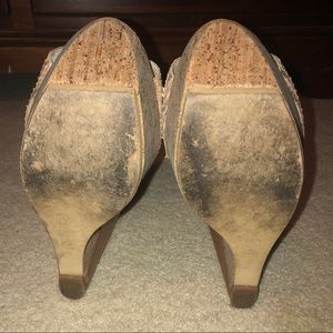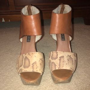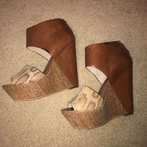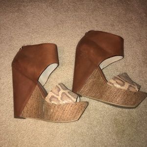 Size 9.5 wedges in good condition. Some wear on the leather and on the snakeskin overlay at the curved edge but not super noticeable while wearing. Gorgeous for a night out on the town for a fraction of the original price. A real show stopper!!! Highest heel point measure 6”. Let me know if you’d like additional measurements.