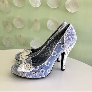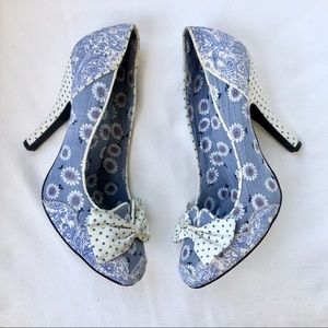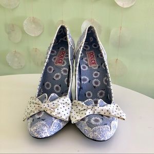 What an amazing and unique pair of pumps. These closed toe denim heels feature boho florals, polka dots and paisley in a feminine and eye catching way. A modern approach to the gunne sax prairie era. These are new without tags and the only flaw is a tiny spot on the rim and some glue reside on one of the bows. Not very noticeable (pic 7).