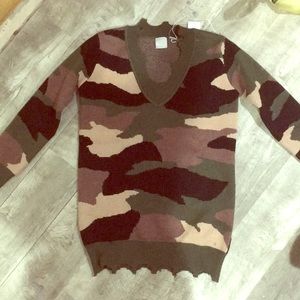 Brand new designer sweater tunic. Thick warm material with raw destructed bottom hem. Long sleeve and v neck. Traditional camo print.