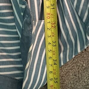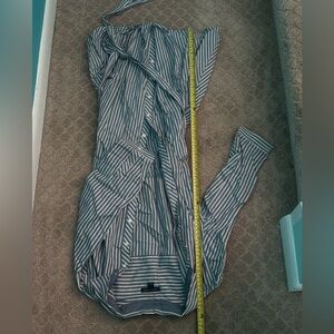 Blue and light pink striped t-shirt dress from Tommy Hilfiger. Buttons go all the way down. Tie wrap around waist and 3/4 sleeves. The pink is really subtle and could pass for white.