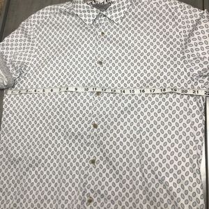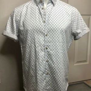 An allover print enlivens a ready-for-anything chambray shirt styled with short sleeves and a hidden button-down collar.